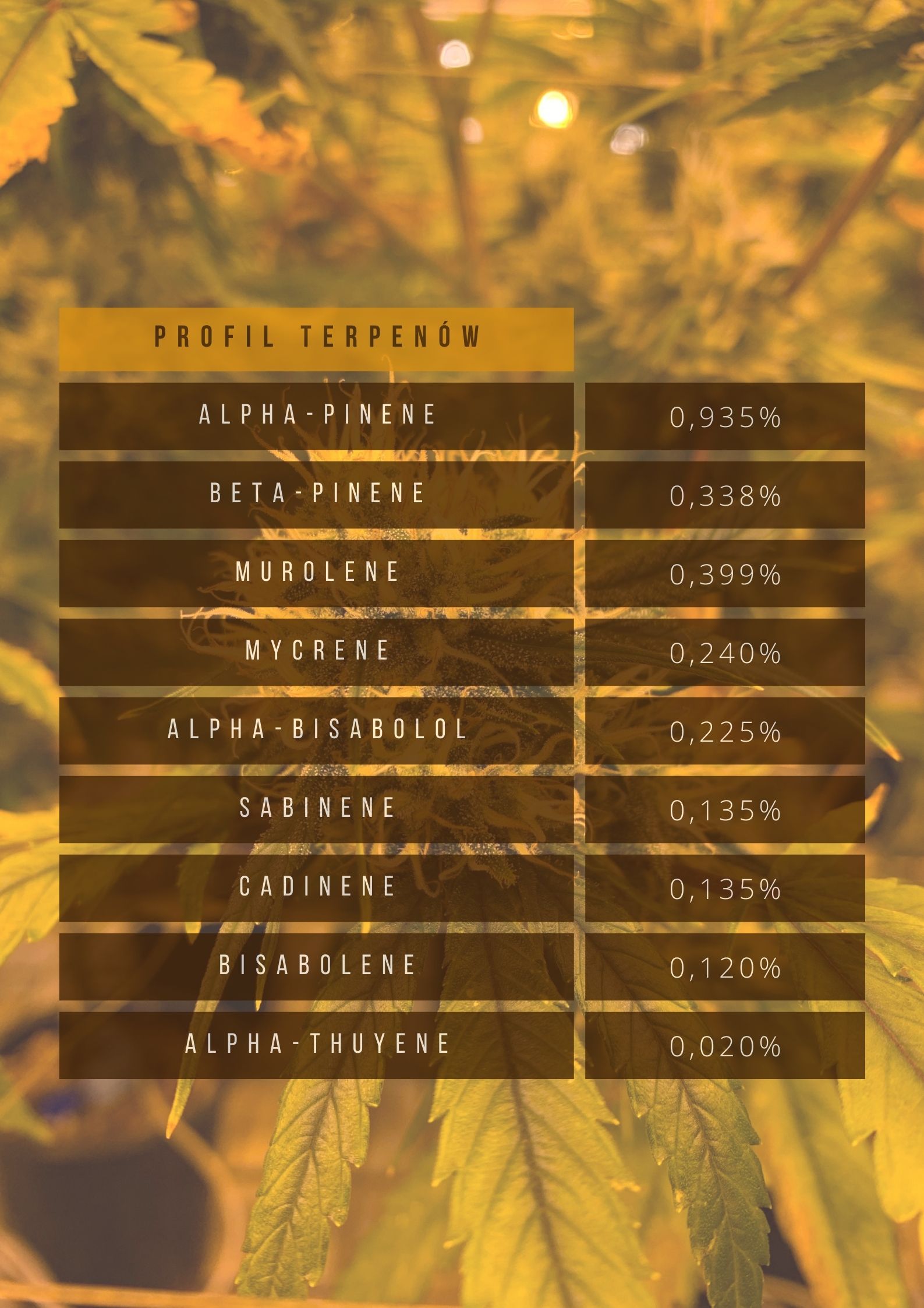 Olejki testowane są nie tylko pod względem obecności terpenów ale oczywiście badany jest też ich profil kanbinoidowy. Badanie dotyczy pełnych parametrów CBD, CBDa, CBDV, THC, THCa, THCV, CBG, CBGa, CBN i CBC aby zapewnić odpowiednie oznakowania a poziomy THC są poniżej prawnie dopuszczalnego.